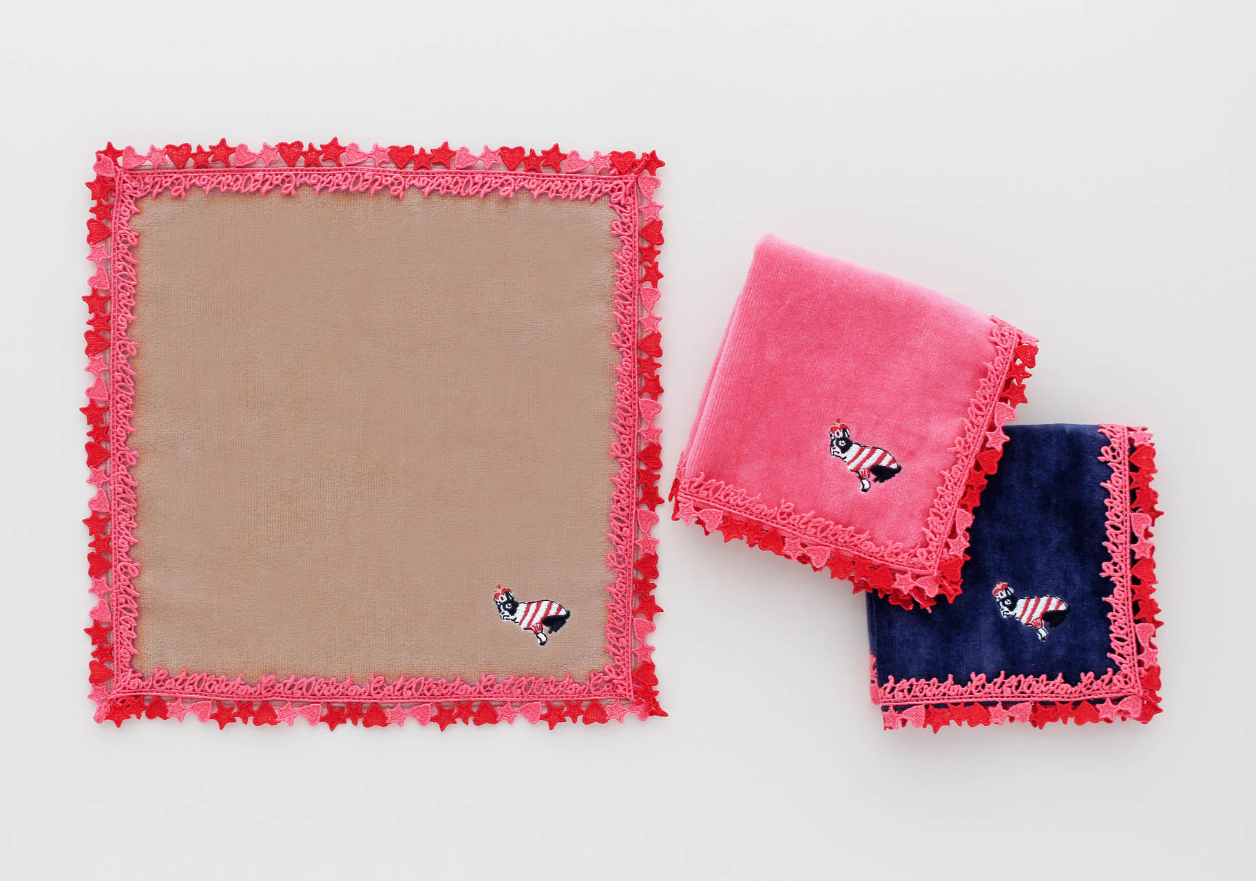 明るいピンクと赤が目を惹く、ロゴとハート&星のレースで縁取った華やかなタオルハンカチ。