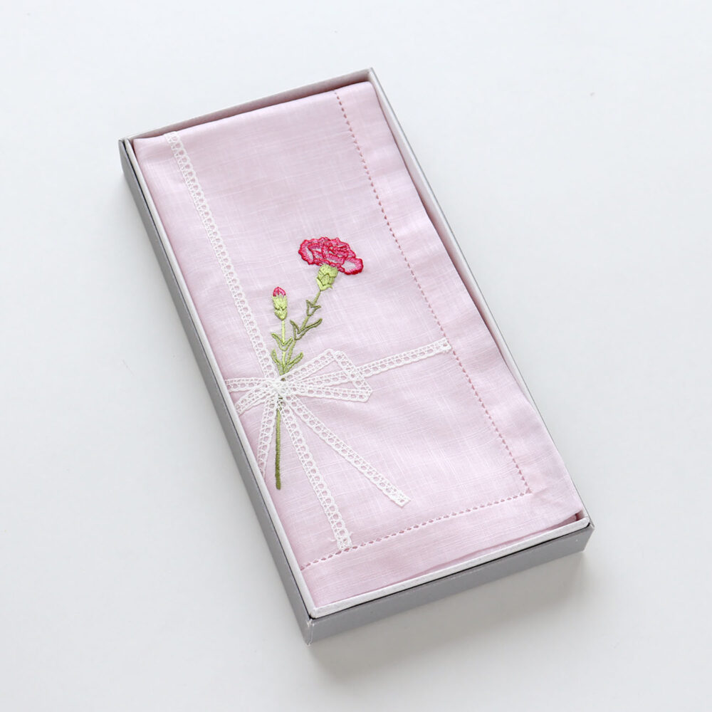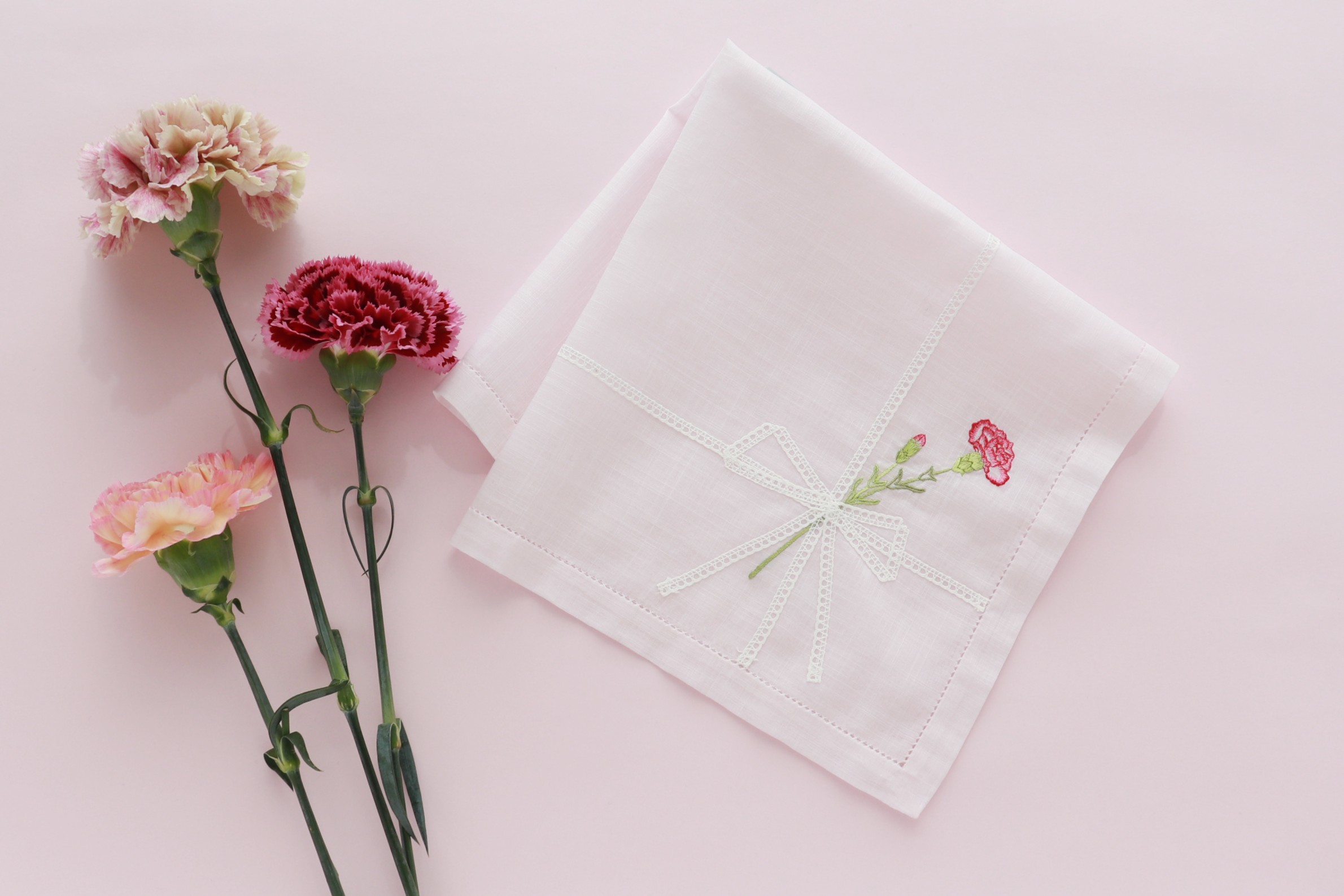 手刺繍ならではの温かみと、母の日の象徴でもあるカーネーションリボンのモチーフが魅力のハンカチです。