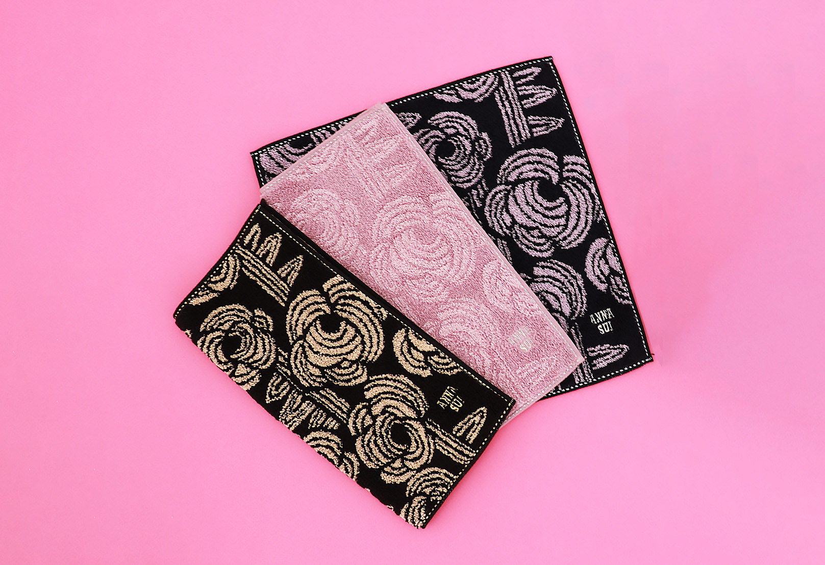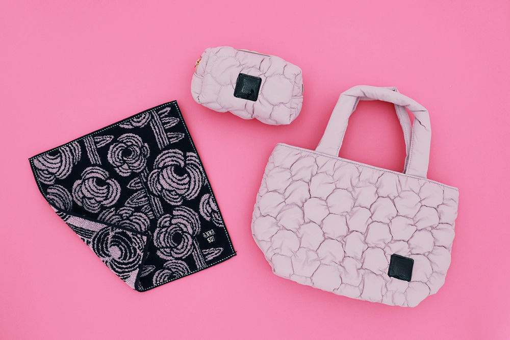 裏地には、ANNA SUIのコレクショ ンのアーカイブ柄から、大胆なローズが目を惹く「RIBBED ROSES」をセレクト。