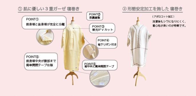 日本の伝統的な浴衣構造を活かしながら、寝たままでも着脱しやすく、観察・処置のしやすさにも配慮した設計が特長で、30年間看護師として働いた経験を持つ開発者の知見と現場の声をもとに企画されました。
