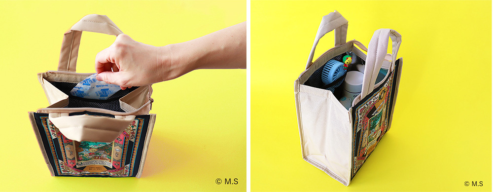 ↑保冷剤や小物が入る便利なメッシュポケットつきです。