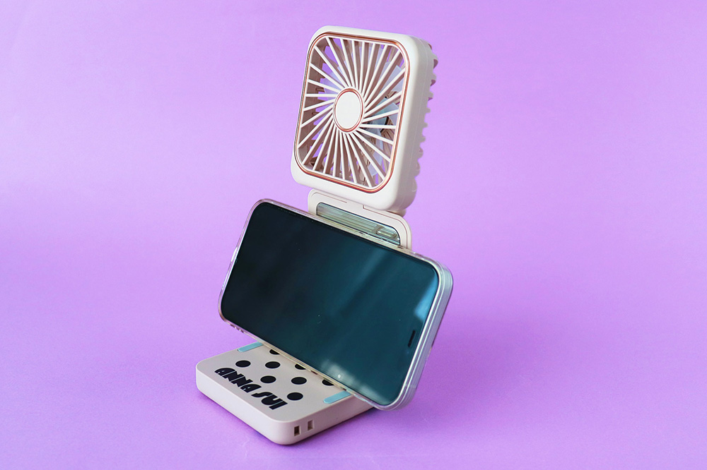 スタンド付きで、卓上・携帯の2WAYで使用できるハンディファン。