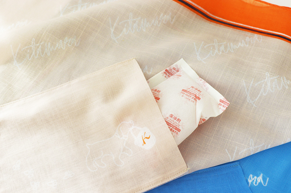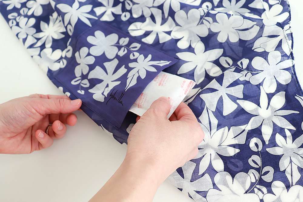 大判ハンカチの内側に、保冷剤を入れられる専用ポケットを設けました。