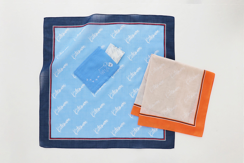 ↑エレガントなキタムラロゴが地模様に入り、ポケットにはキタムラのバッグをくわえた犬のデザイン