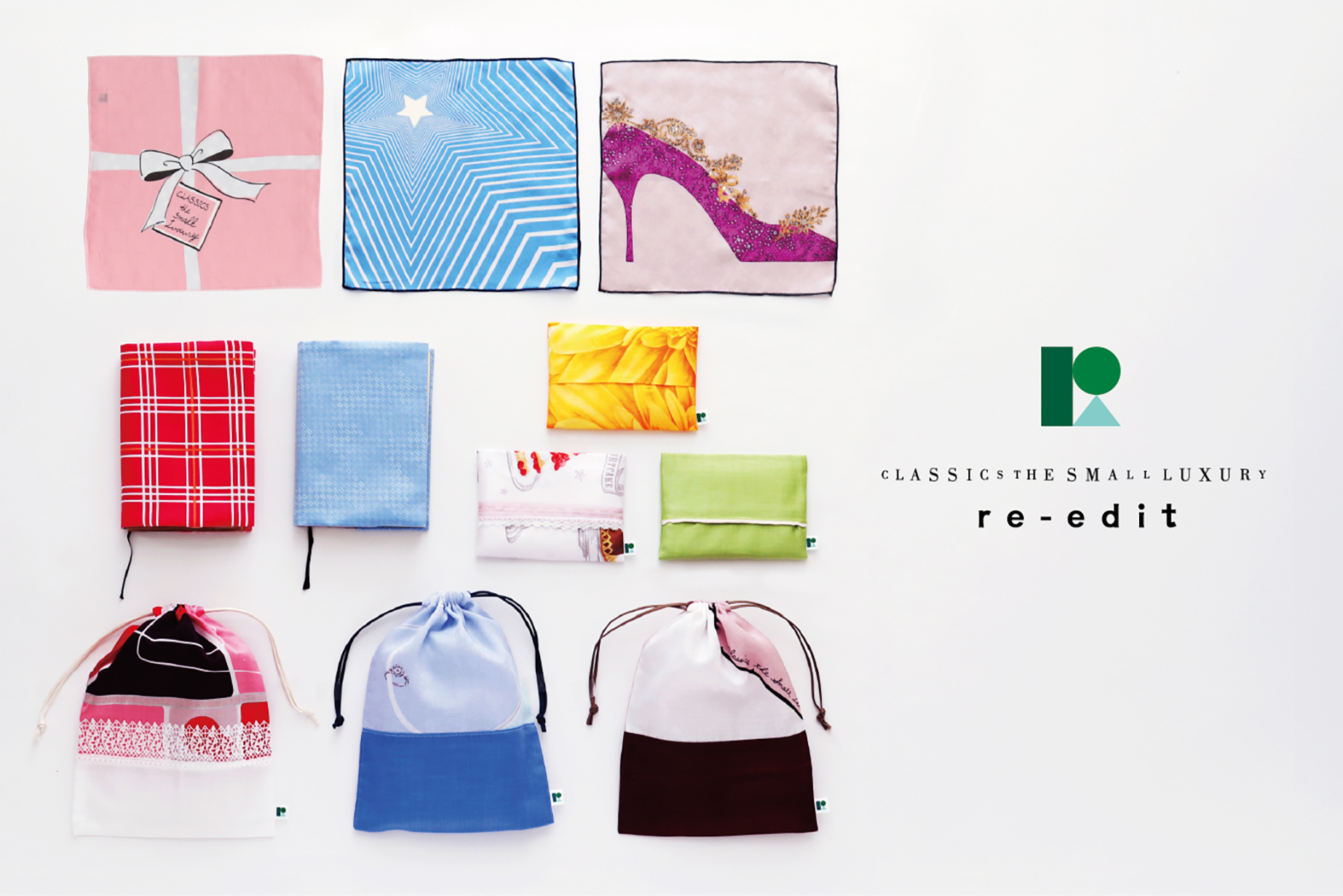 3回目の出店となる今回、当社が運営するハンカチーフ専門ブランド「CLASSICS the Small Luxury」より、ハンカチーフをリメイクした「re-edit(リ・エディット)」シリーズのブックカバーやポーチなどの雑貨アイテムを販売します。また、訳ありハンカチと、こども向けハンカチ『bloomie’s(ブルーミーズ)』のハンカチを特別価格で販売します。春の新生活を彩るラインアップをご用意しております。